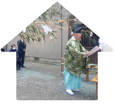 | 契約後、着工前に安全祈願をする儀式として地鎮祭を行います。 新しく建物を建築すること、そしてそこに住むことを神様に報告することで、安全・安心に暮らしていけるよう願う儀式です。 |